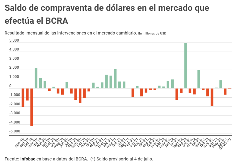 Por operaciones con dólar agro se registran en esta tercera etapa ingresos por USD 5.417,2 millones desde el 10 de abril a esta parte. Asimismo, desde que empezó el 2023 el balance del BCRA por la intervención cambiaria es negativo en USD 2.788 millones, mientras que en junio cerró un saldo vendedor por 682 millones de dólares.