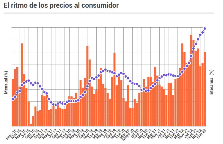 La inflación de enero pasado, la primera medición del 2023, fue del 6%, según el índice de Precios al Consumidor (IPC) que informó este martes el Instituto Nacional de Estadística y Censos (Indec). De esta manera, el acumulado de los últimos doce meses alcanzó el 98,8 por ciento.