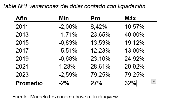Lamentablemente no es la primera vez que ocurre lo descripto previamente. Desde el año 2011 en adelante vemos bruscas subas en los años electorales. En la tabla Nº1 se puede apreciar las variaciones observadas en el dólar contado con liquidación (CCL) obtenido de la resultante de cambiar acciones de Galicia en el mercado local por ADR de este subyacente en Estados Unidos.