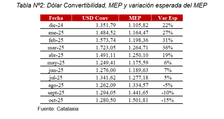 Tal y como puede apreciarse en la Tabla Nº2 se muestra la evolución del dólar convertibilidad, el dólar MEP y la variación esperada (Var Esp) del MEP para alcanzar en igualdad al dólar convertibilidad. En los primeros meses del año veíamos un dólar convertible muy por encima del MEP lo que llevaba a pensar que era inminente una devaluación. Sin embargo, después del acuerdo con el FMI las reservas internacionales se engrosaron y el dólar convertible se redujo drásticamente en mayo. Lo contrario pasó a partir de agosto, fue el dólar MEP el que empezó a escalar producto de una fuerte dolarización de los portafolios a la espera del resultado electoral. En este sentido, vemos que el precio del MEP esta muy alejado del fundamento teórico y si esperamos que vuelva a niveles observados entre mayo y julio lo mas sensato es esperar una baja del 10% y un tipo de cambio muy cercano a los $1.300 una vez que se dirima la contienda electoral.